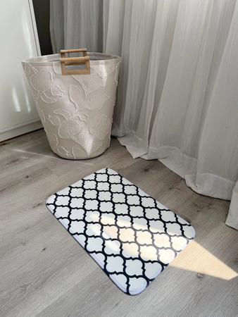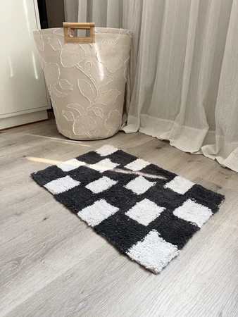 Alfombra de algdon con diseño de rombos en negor con flecoss