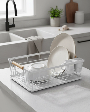 Canasto de alambra con tela blanca con frase impresa "Don't worry, be happy"