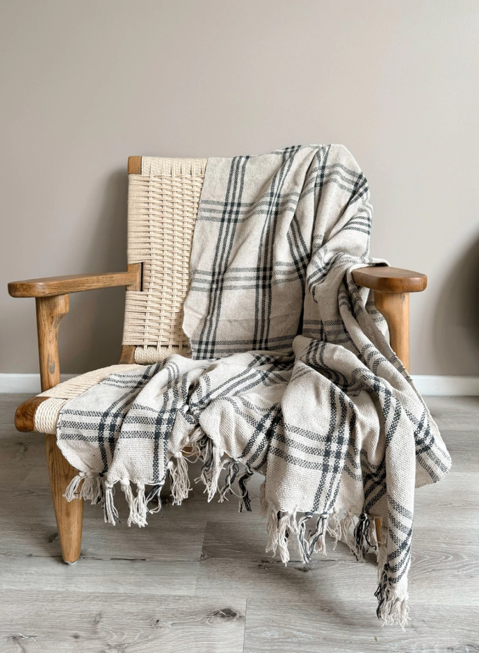 Manta de algodon rustico de color gris con cuadrilles de color natural con terminacion de flecos