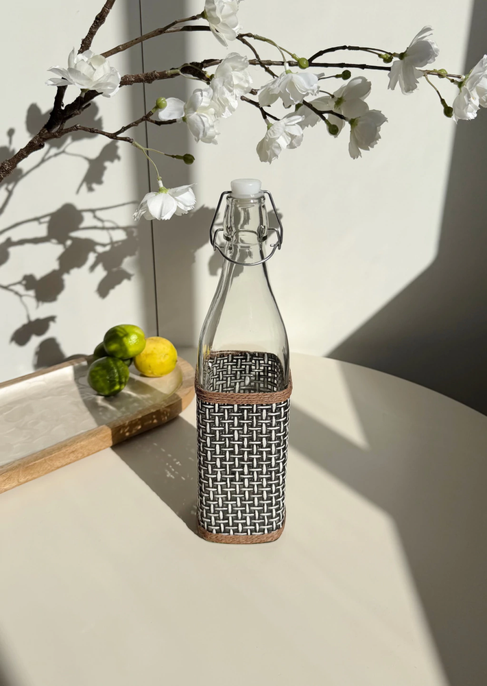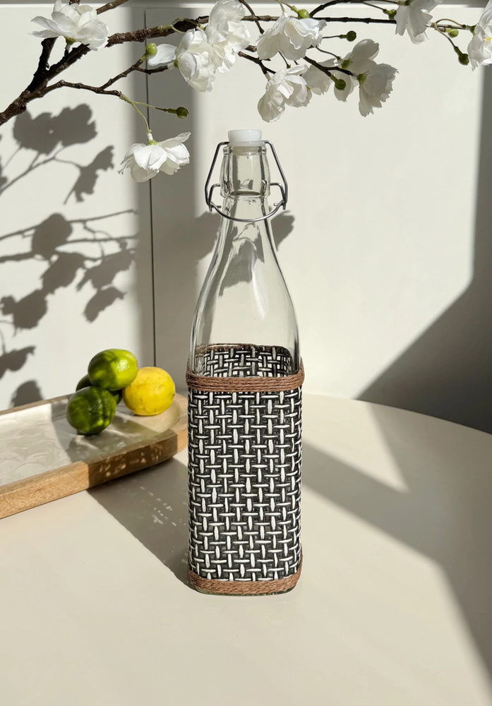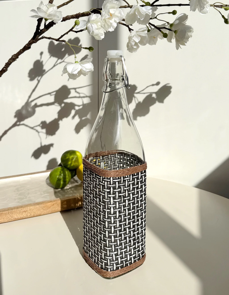Botella de vidrio base cudrada con tapon hermetico y cubierta de seagrass de color negro y blanco