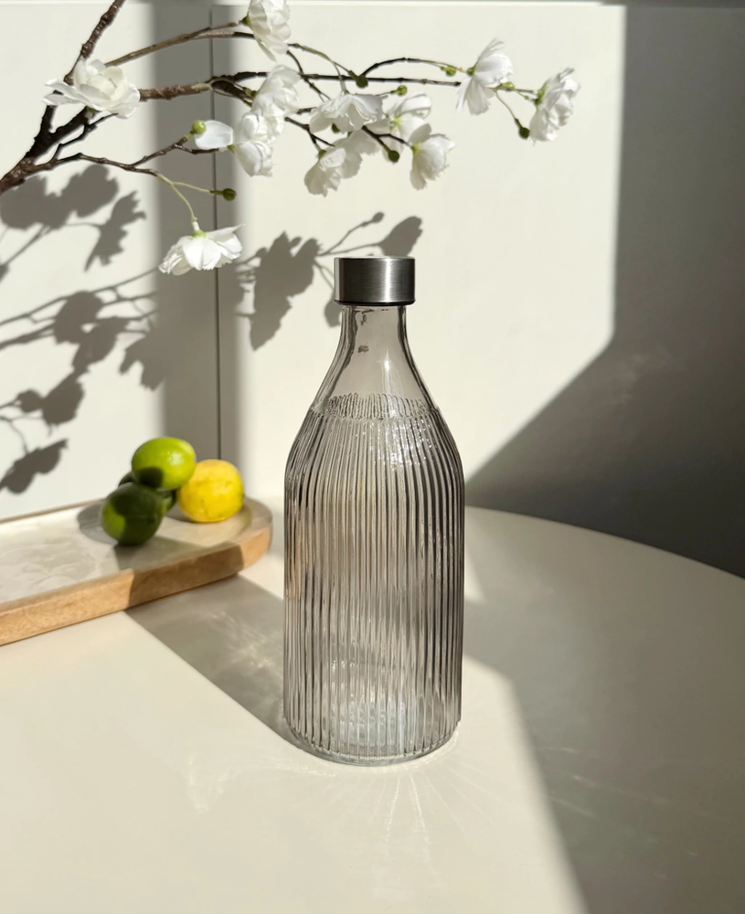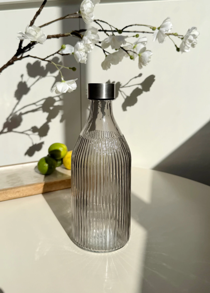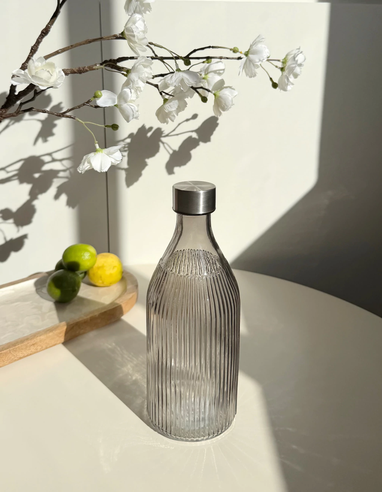 Botella redonda celeste con rayas verticales con tapón acero vidrio