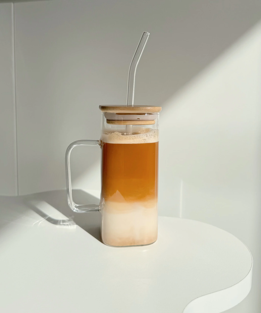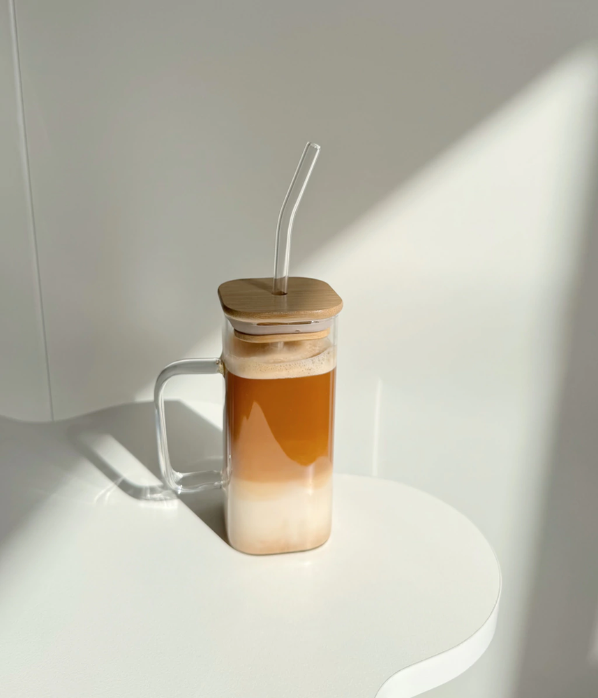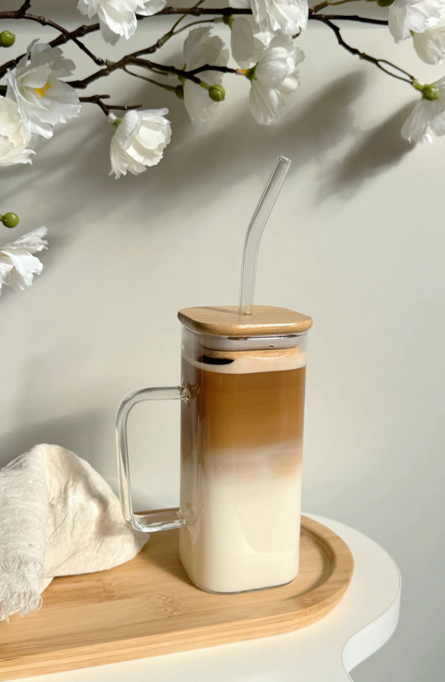 Vaso de vidrio cuadrado con asa y sorbete tapa de bamboo