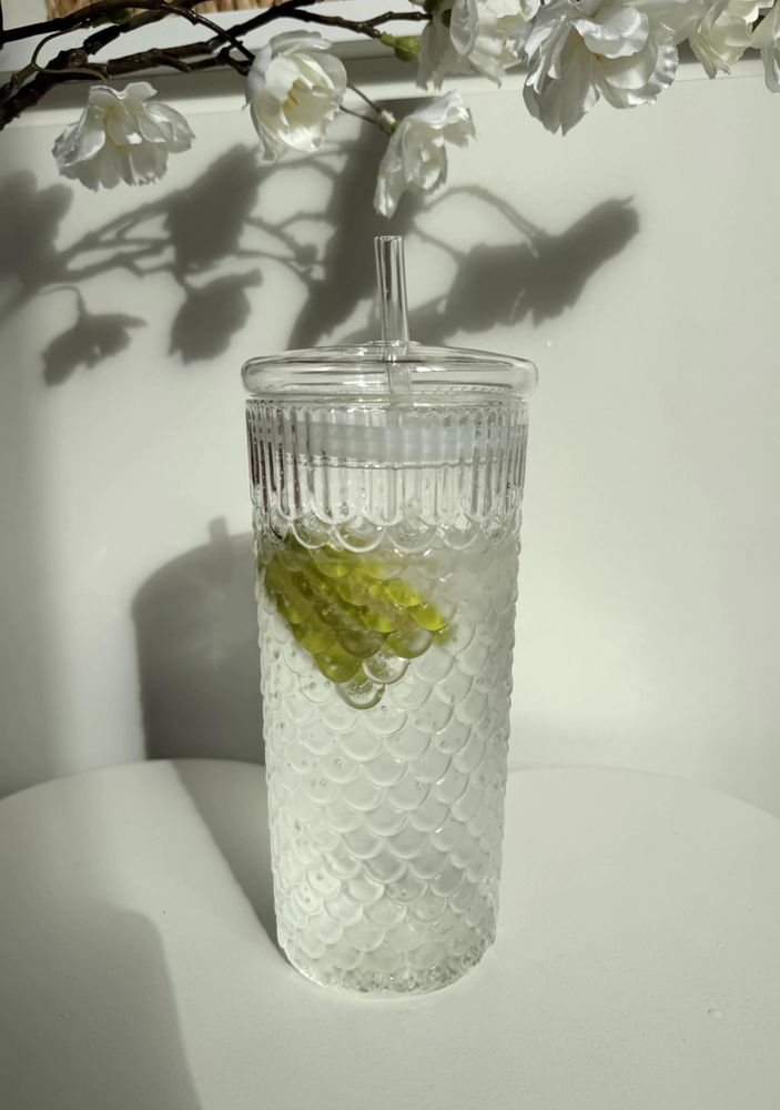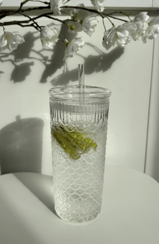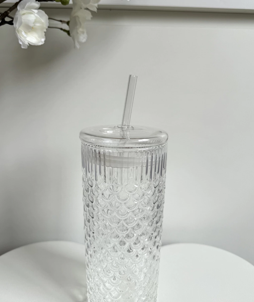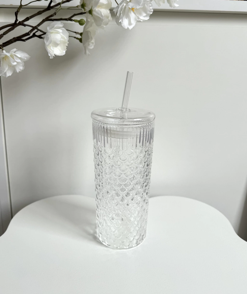 Vaso con sorbete y tapa de vidrio labrado con escamas transparente