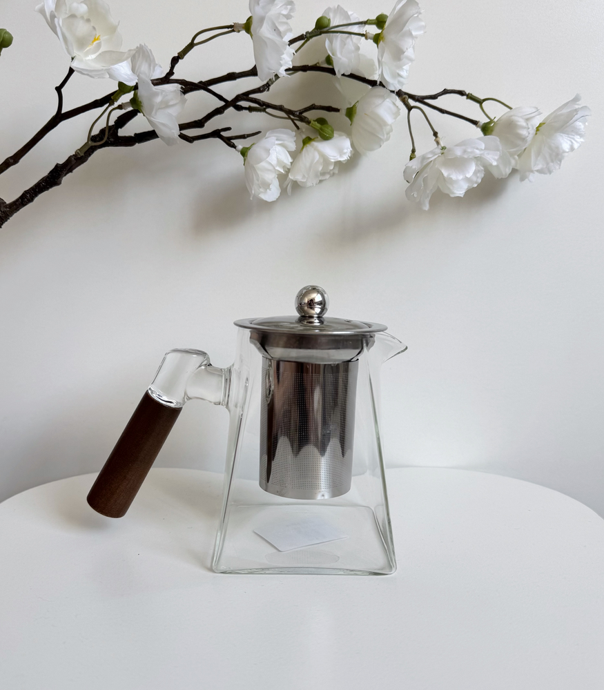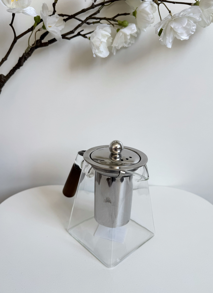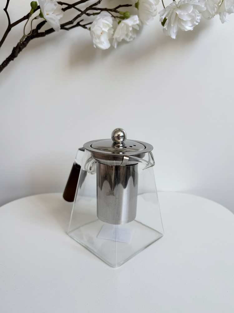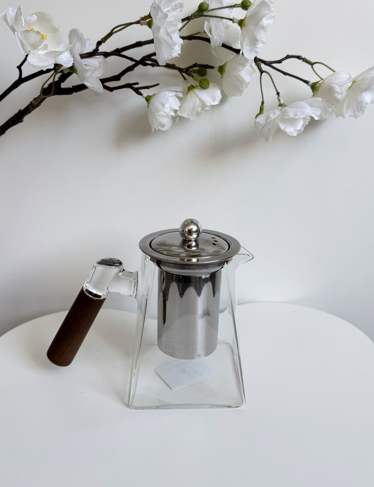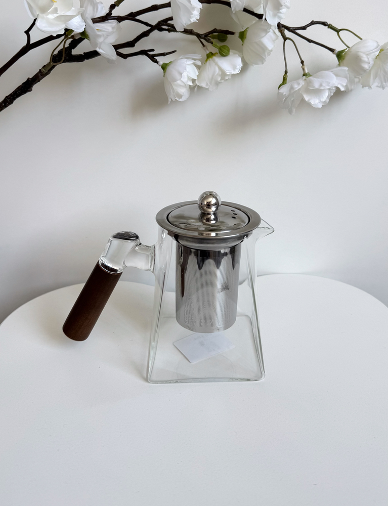 Tetera cónica con base cuadrada de vidrio con filtro de metal, tapa de metal con botón de madera y mango de madera