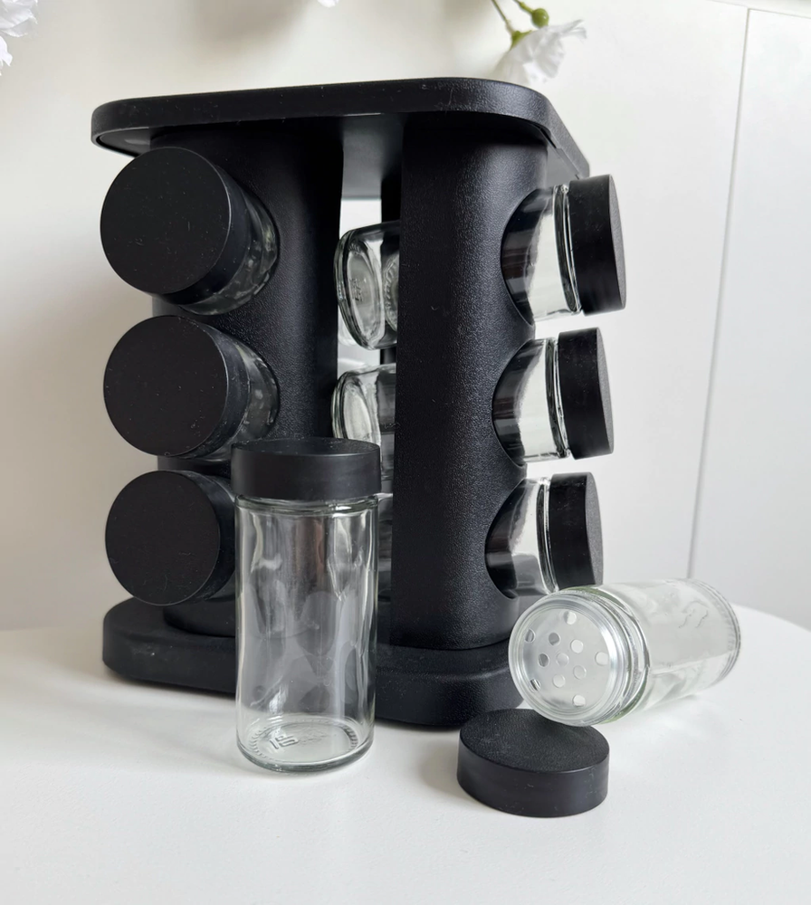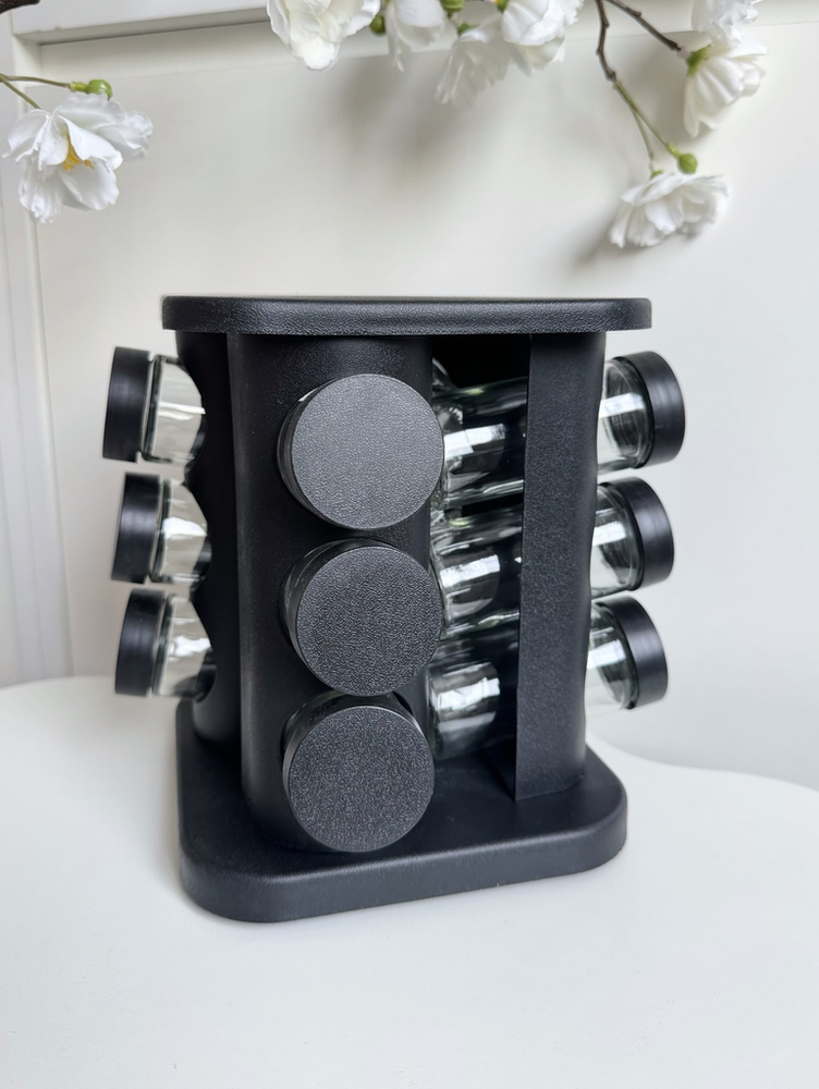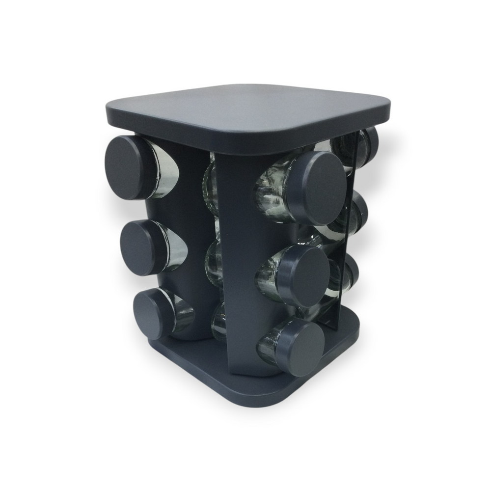 Especiero cuadrado de plástico giratorio de 12 frascos de vidrio negro