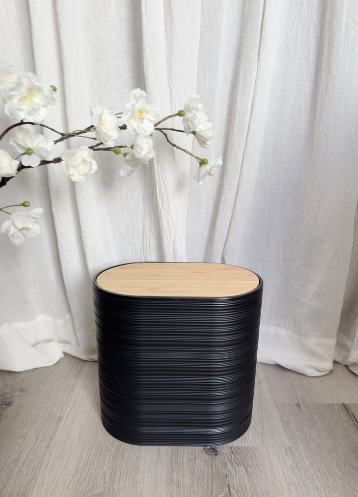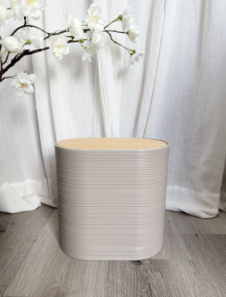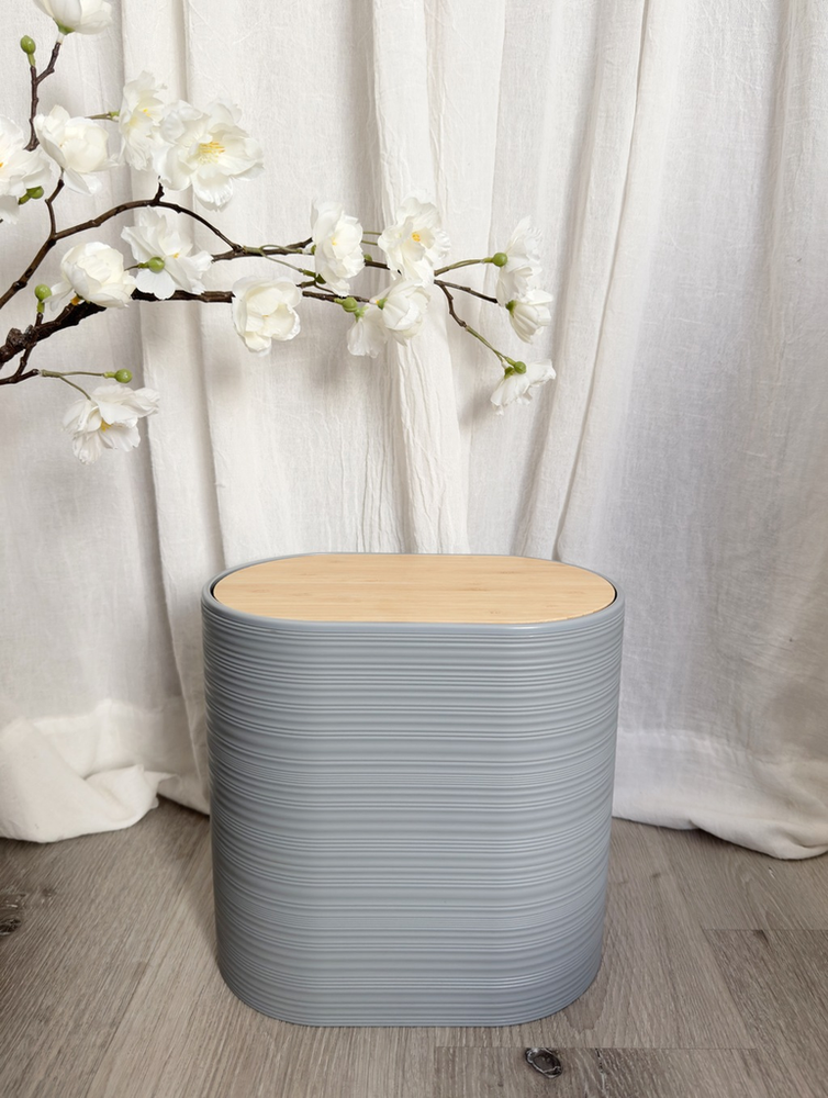Cesto tacho de basura oval rayado de plástico con tapa vaivén de bamboo