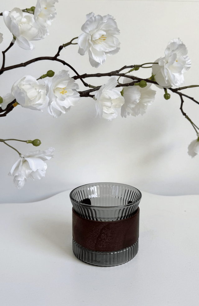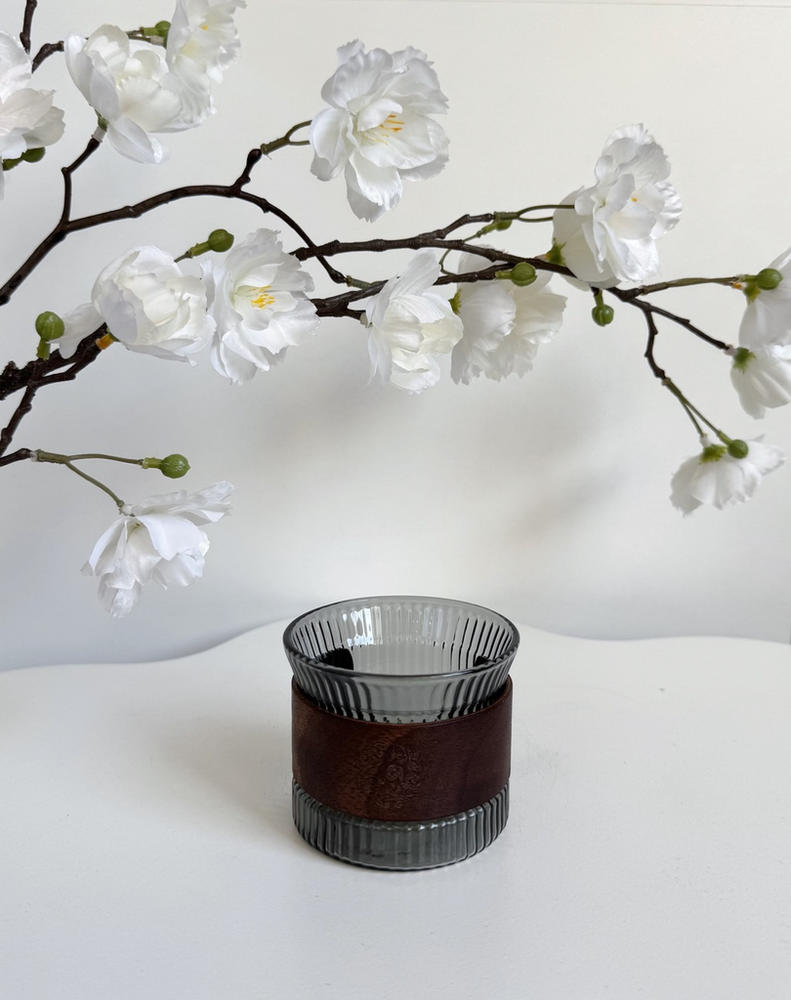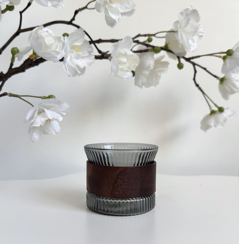 Jarro de café de vidrio térmico rayado transparente con cobertor de madera 120ml