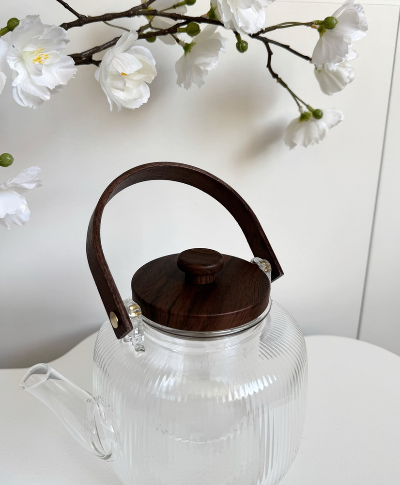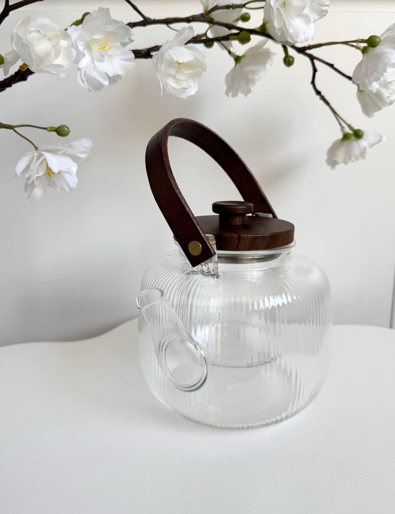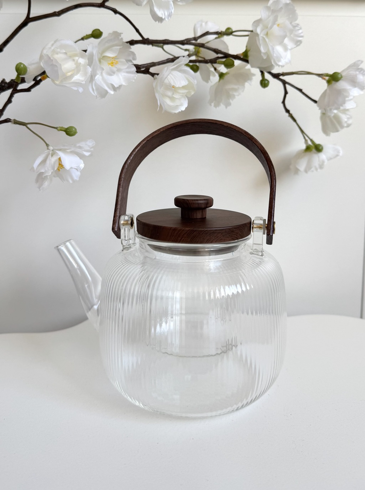 Tetera de vidrio rayada con tapa y mango de madera 1200ml