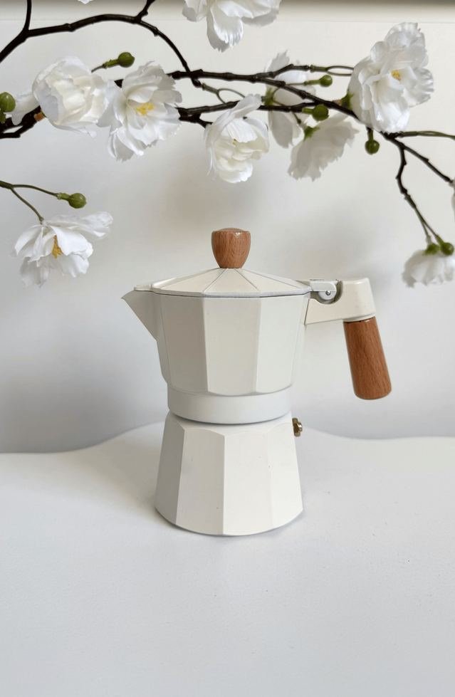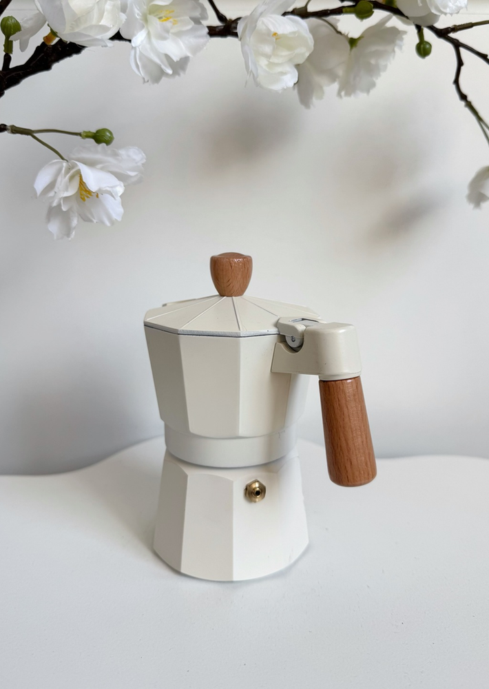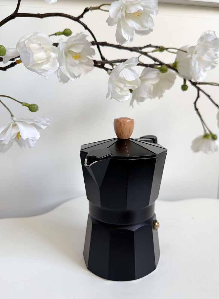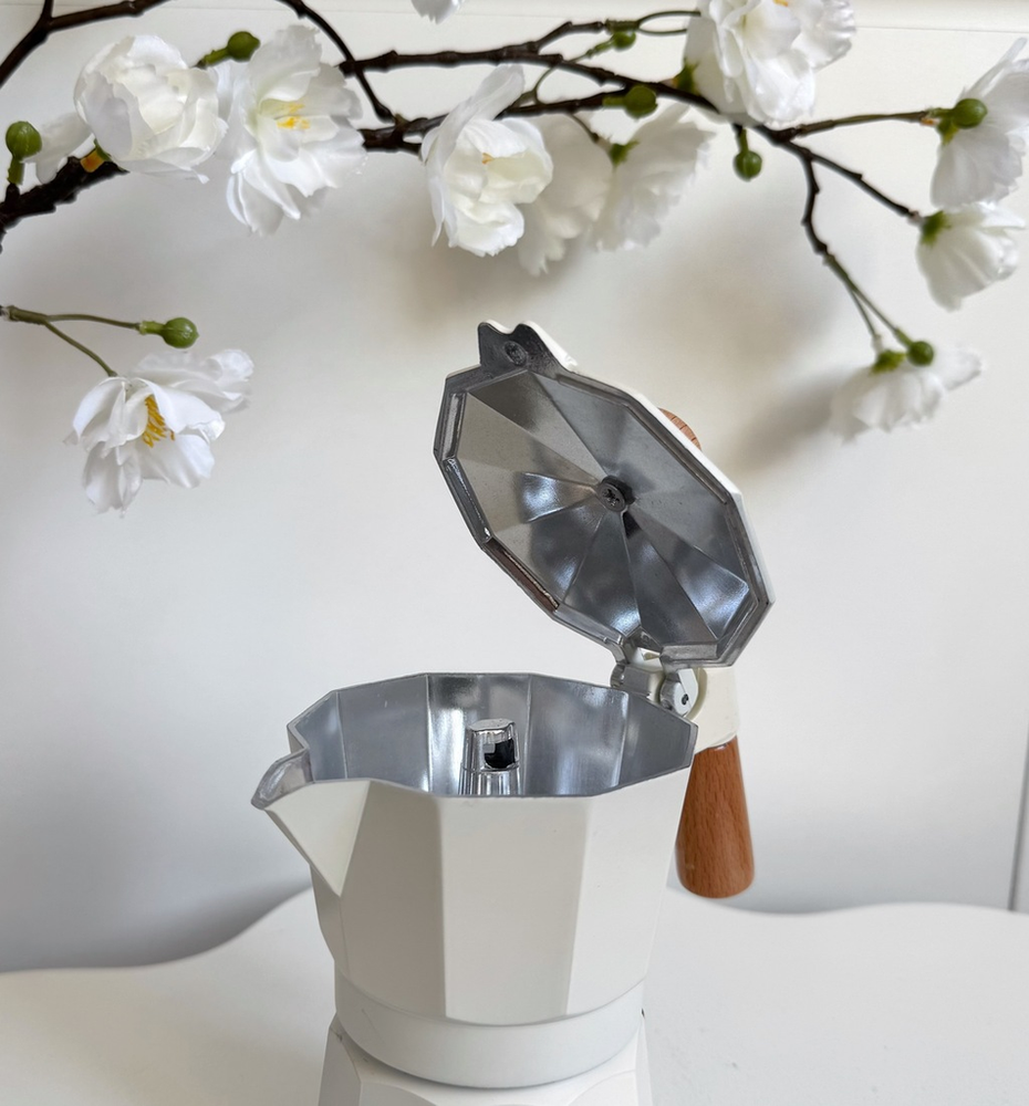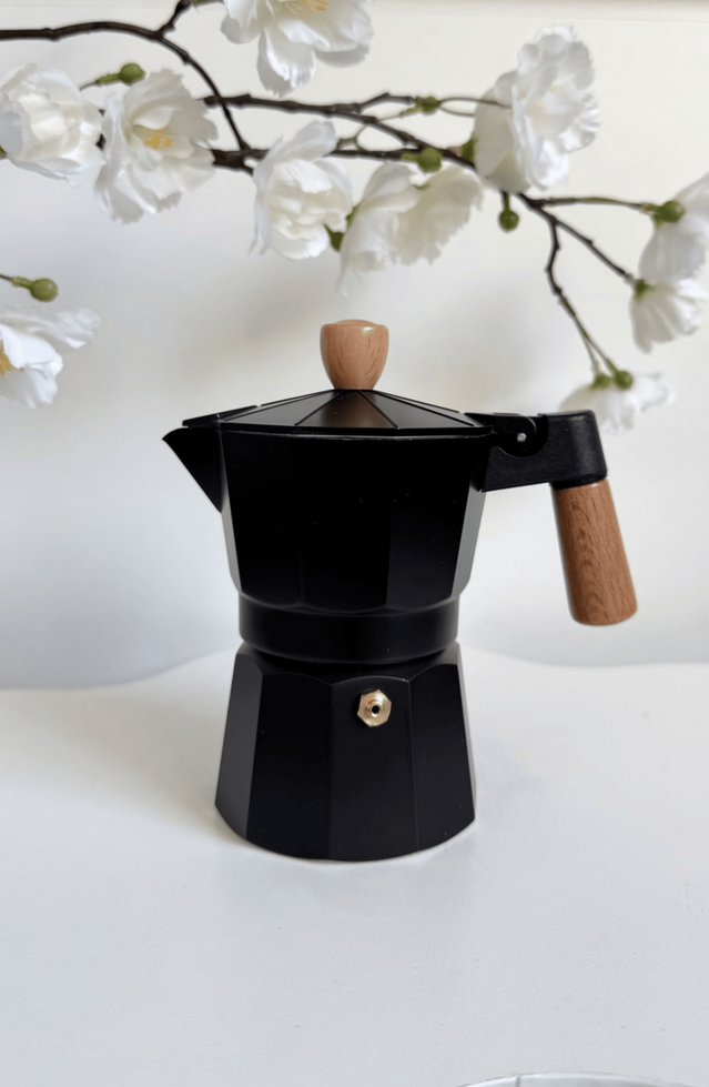 Cafetera italiana de aluminio octogonal 3 cup con mango y botón de bamboo 150ml