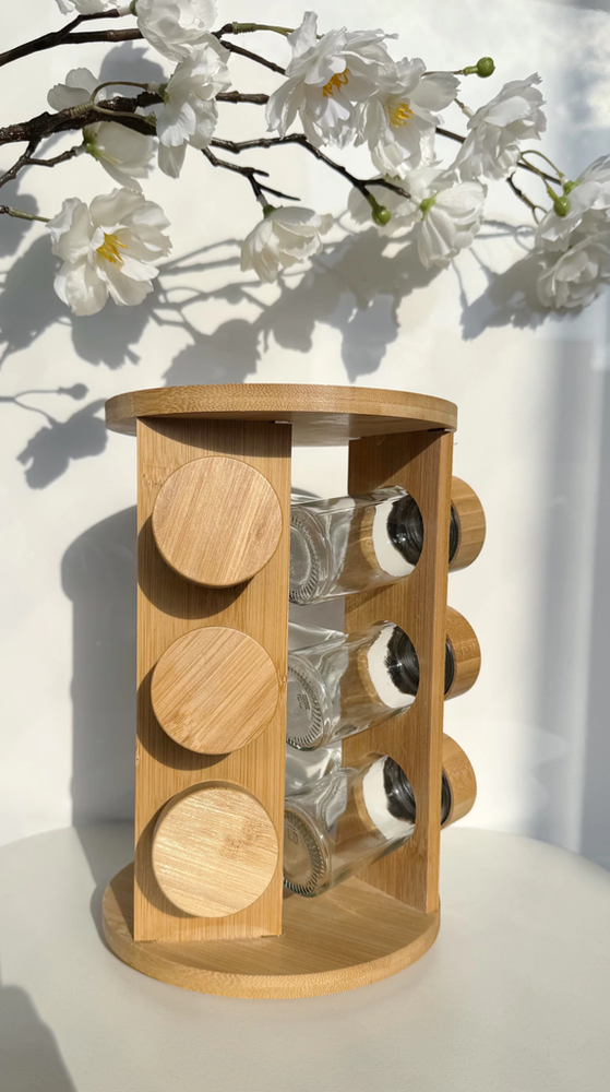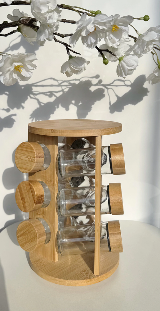 Especiero giratorio redondo con 9 frascos de 100ml con tapa bamboo