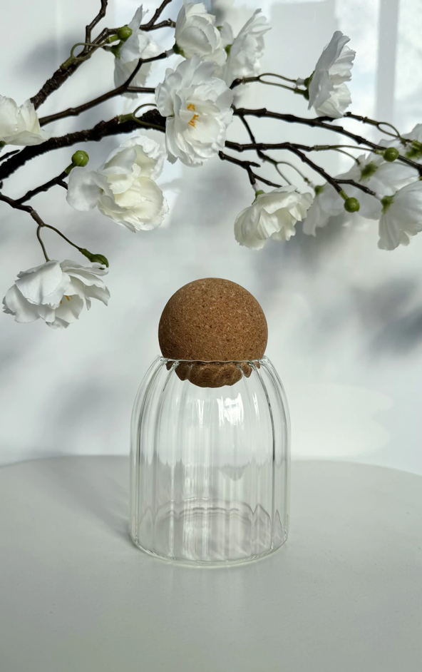 Frasco vidrio bombé con rayas y tapa de esfera de corcho