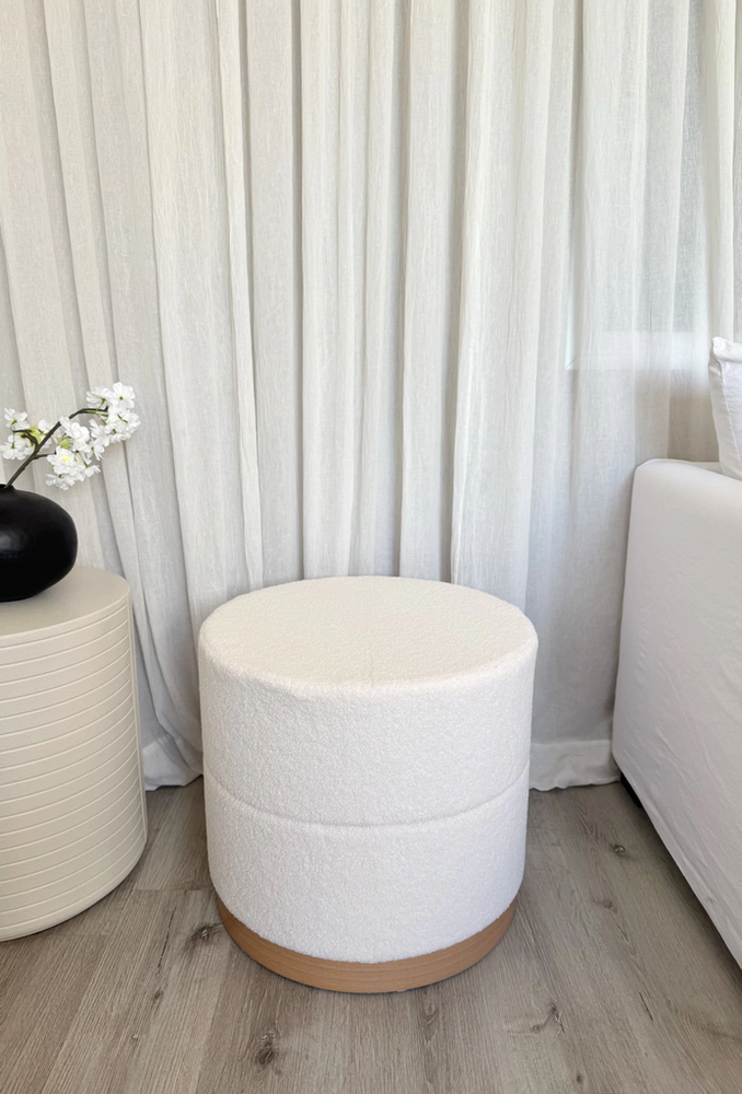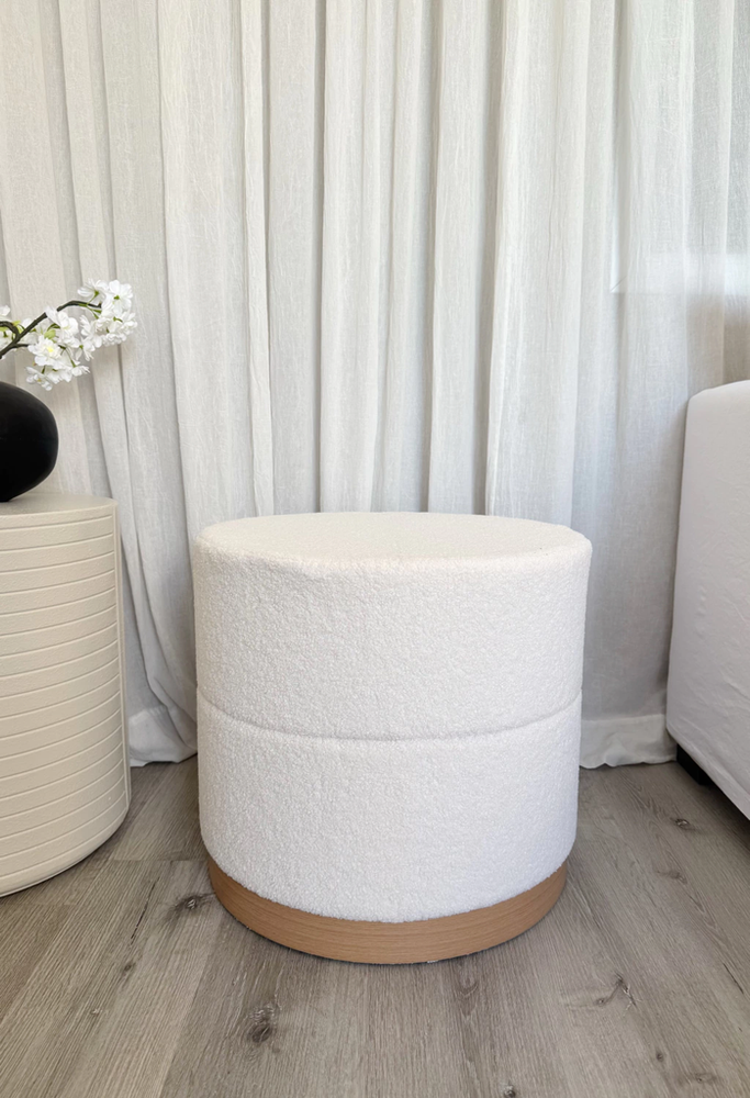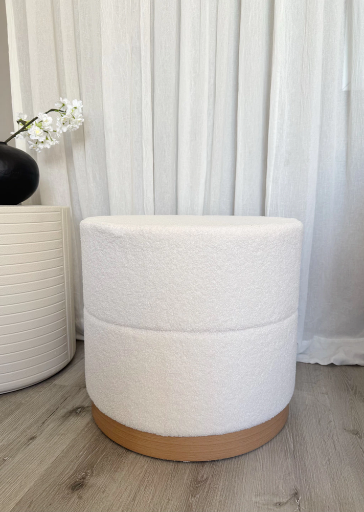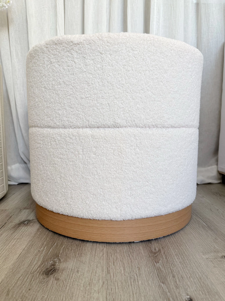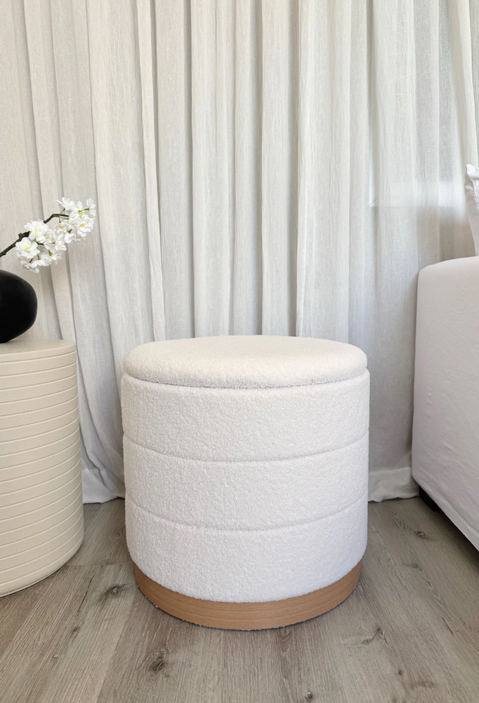 Puff de tela tipo teddy con base de madera y espacio para guardado de color blanco