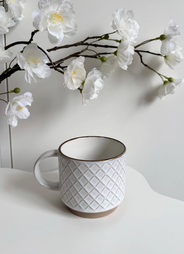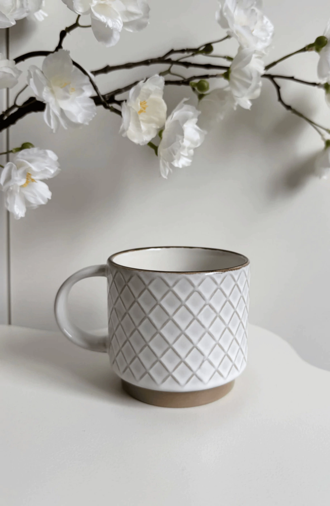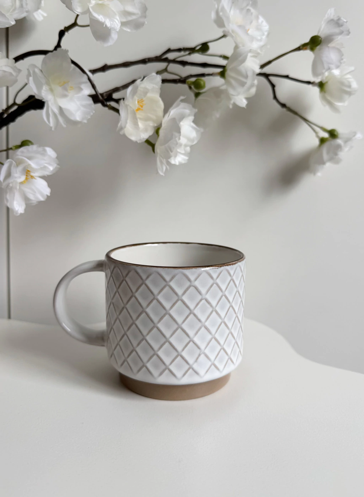 Taza Mug de porcelana blanca con bode y base color beige con diseño de Rombos