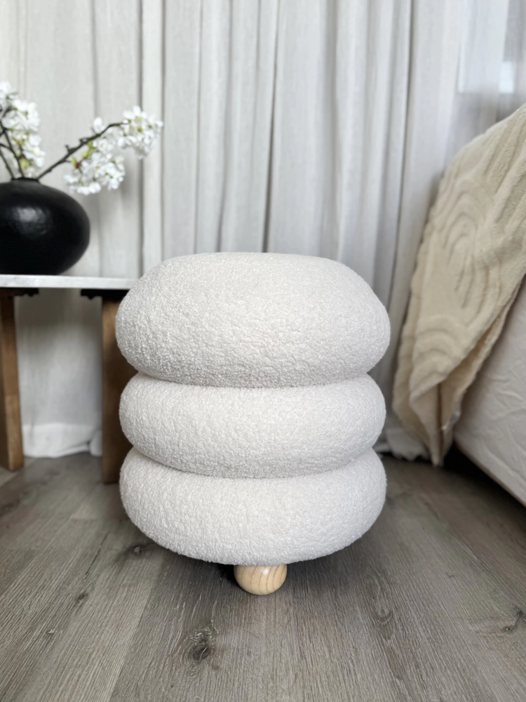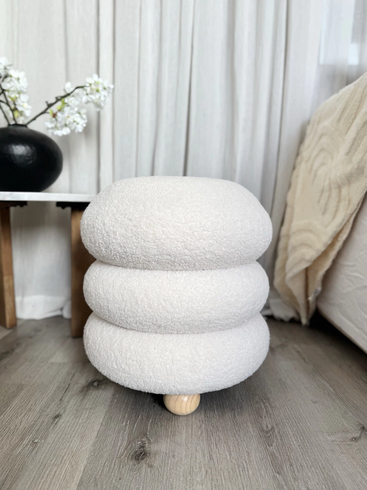 Puff de tela tipo teddy con patas de madera con 3 bucles color blanco