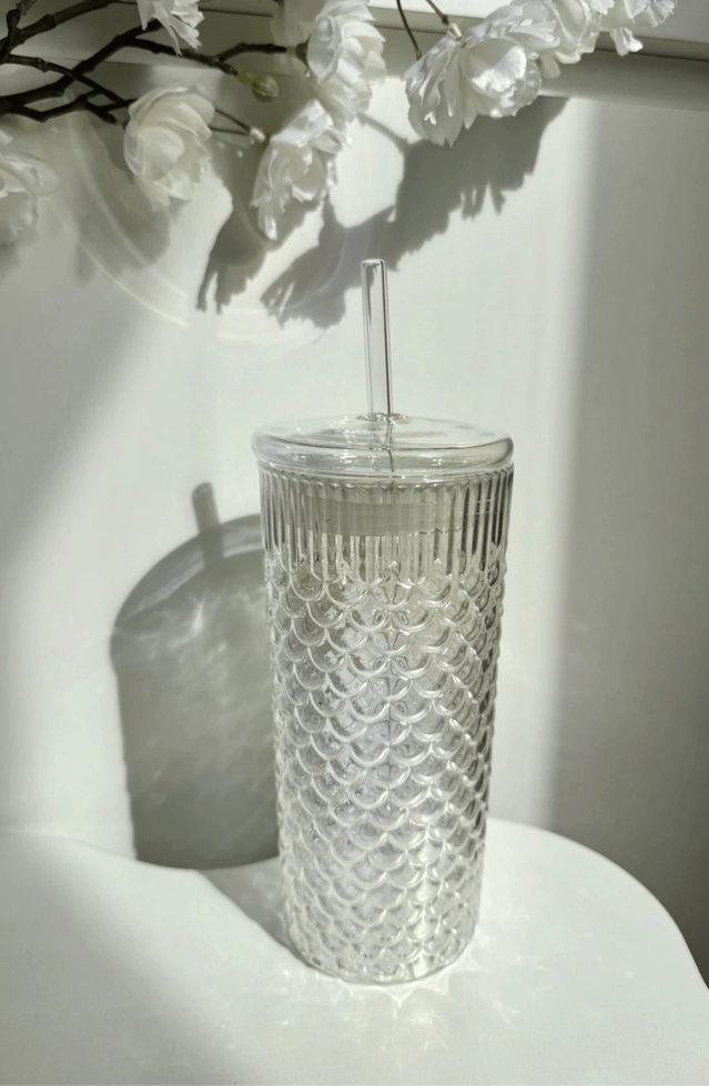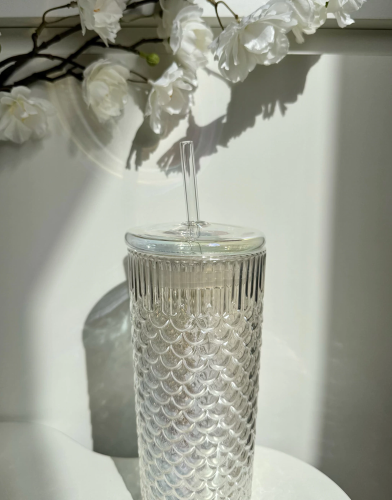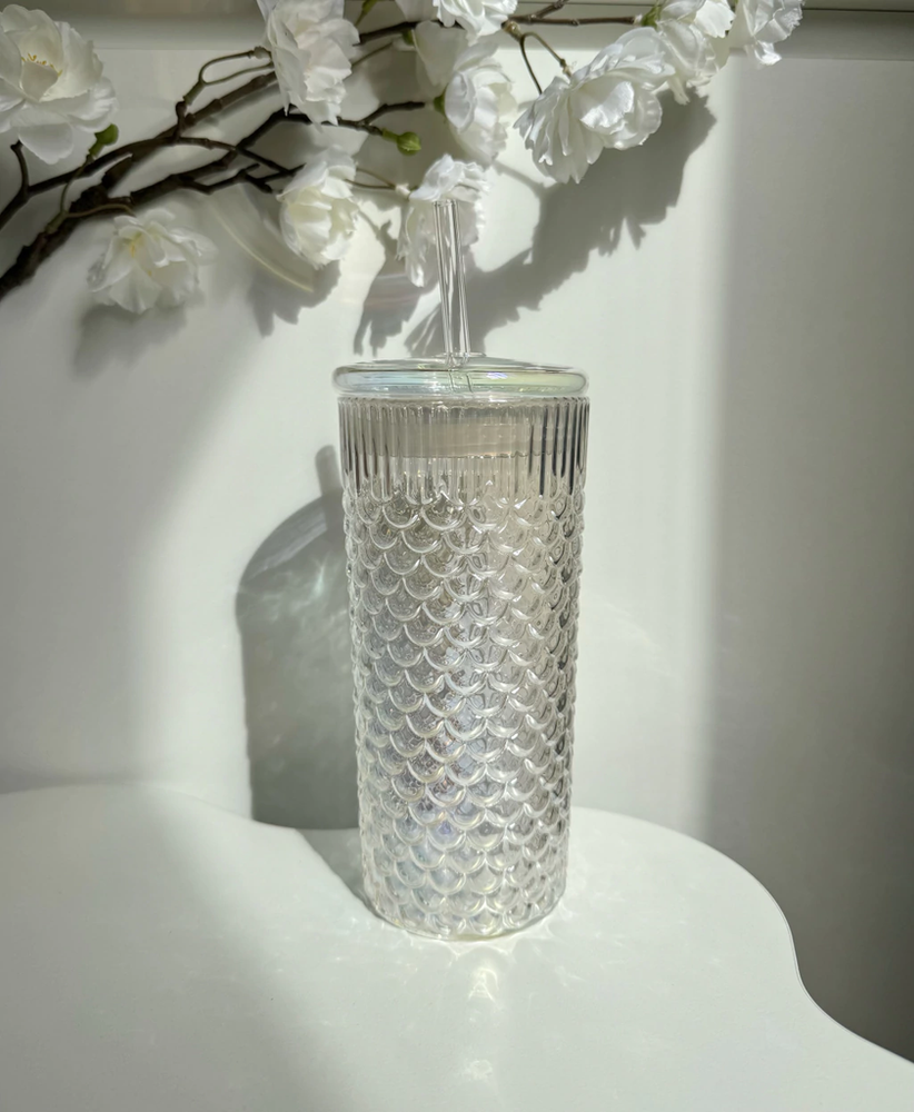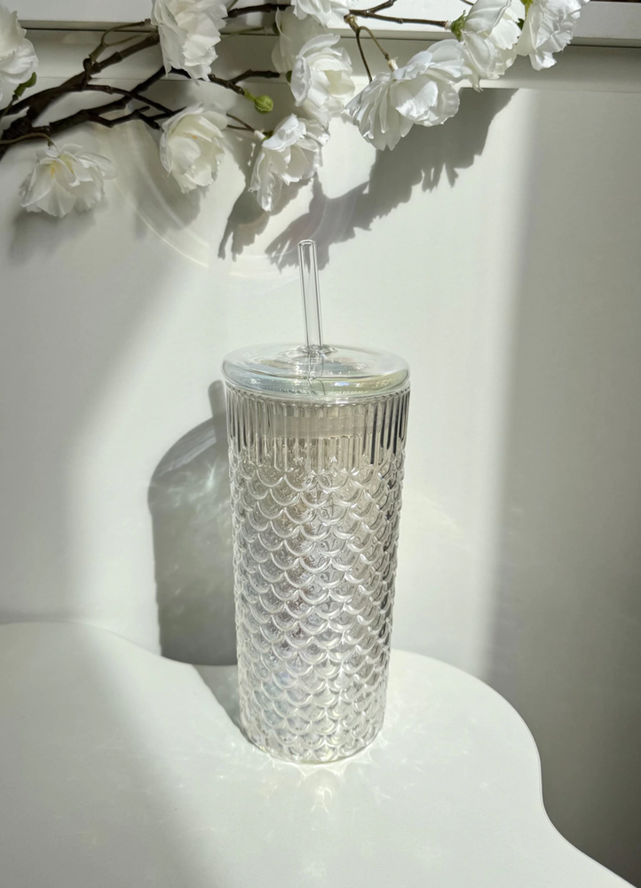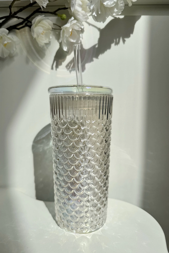 Vaso con sorbete y tapa de vidrio labrado con escamas tornasoladas