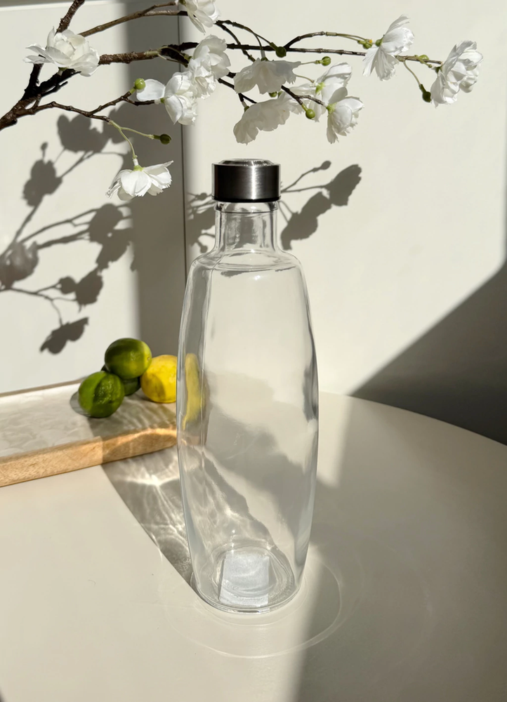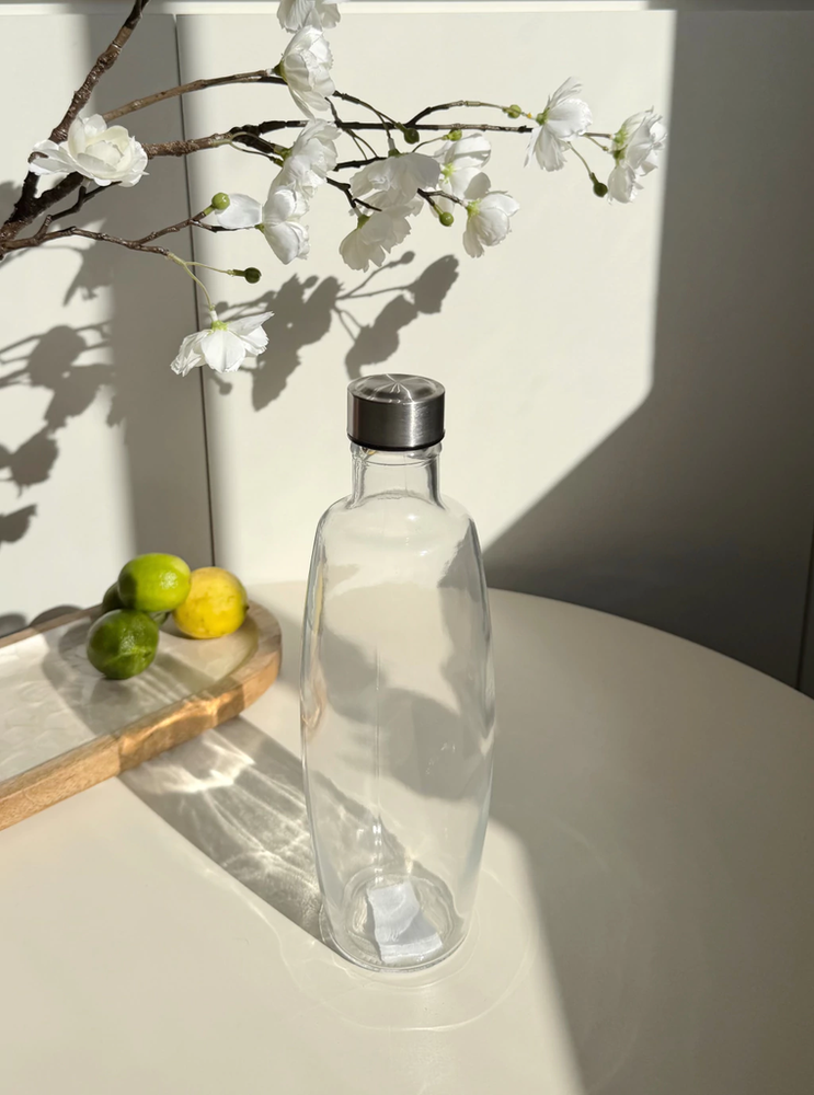 Botella vidrio transparente con tapa acero