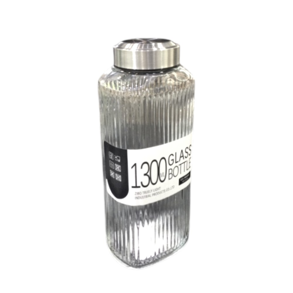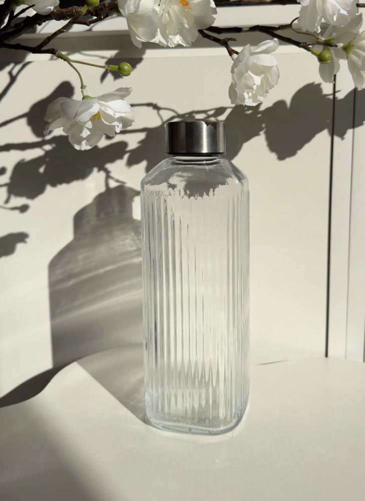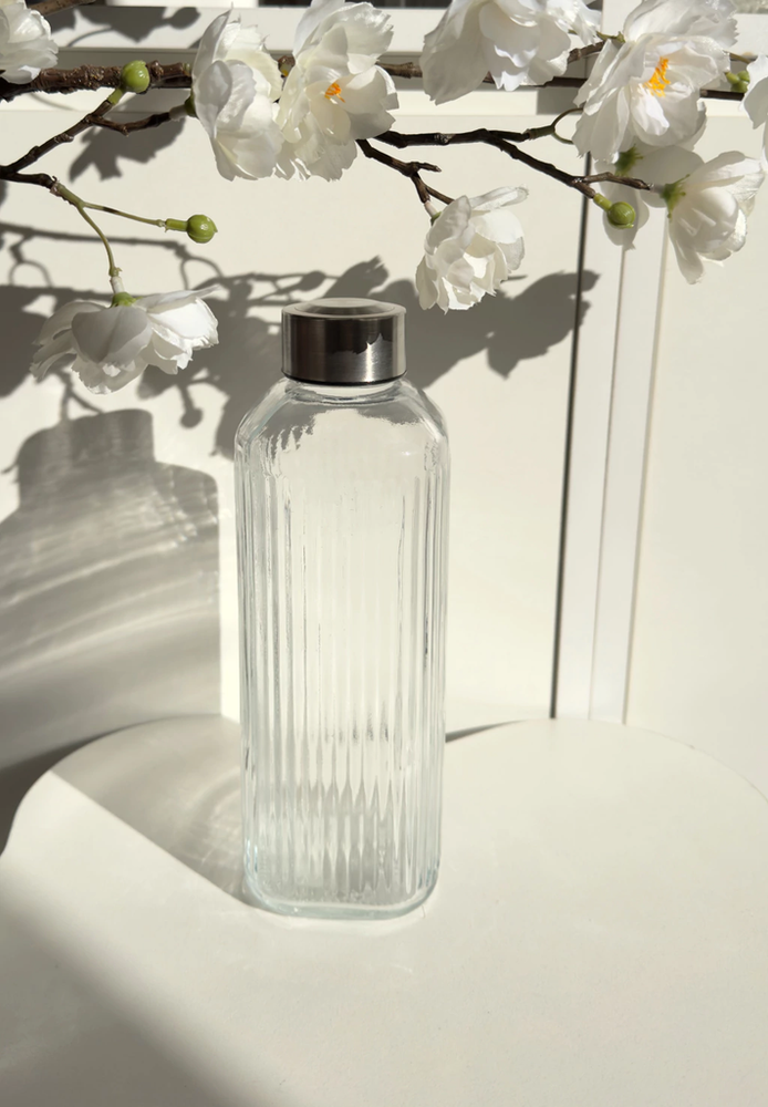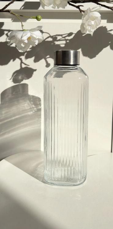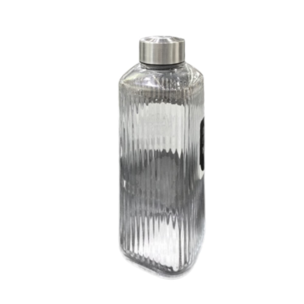 Botella de vidrio rayada con lineas verticales con tapa de acero