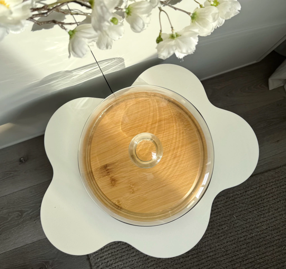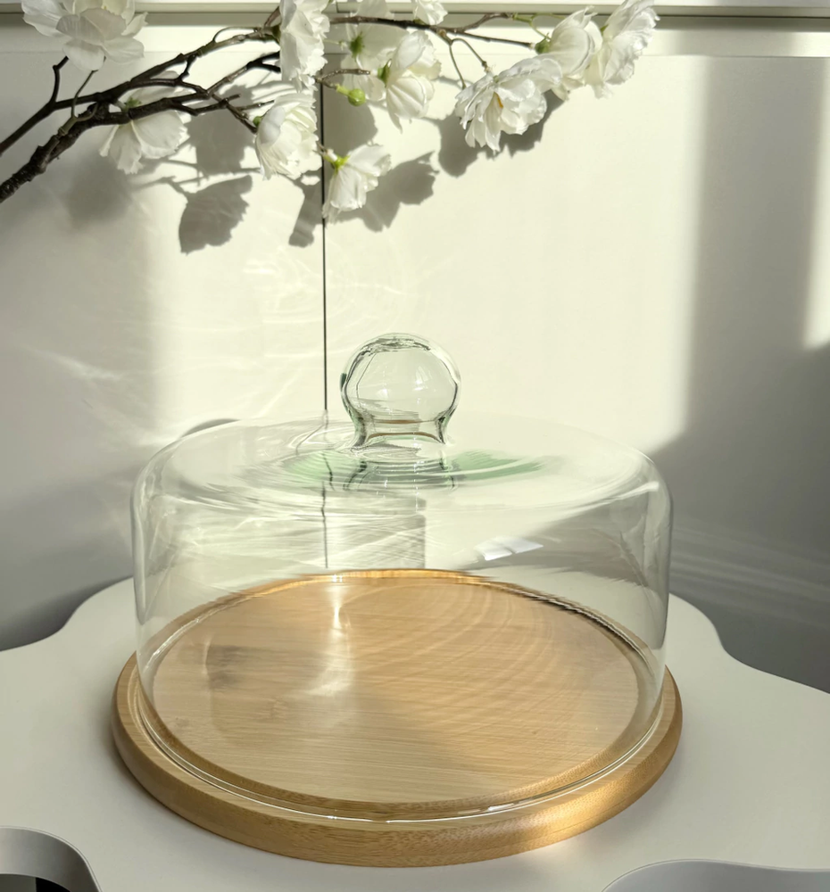 campana de vidrio con plato de bamboo