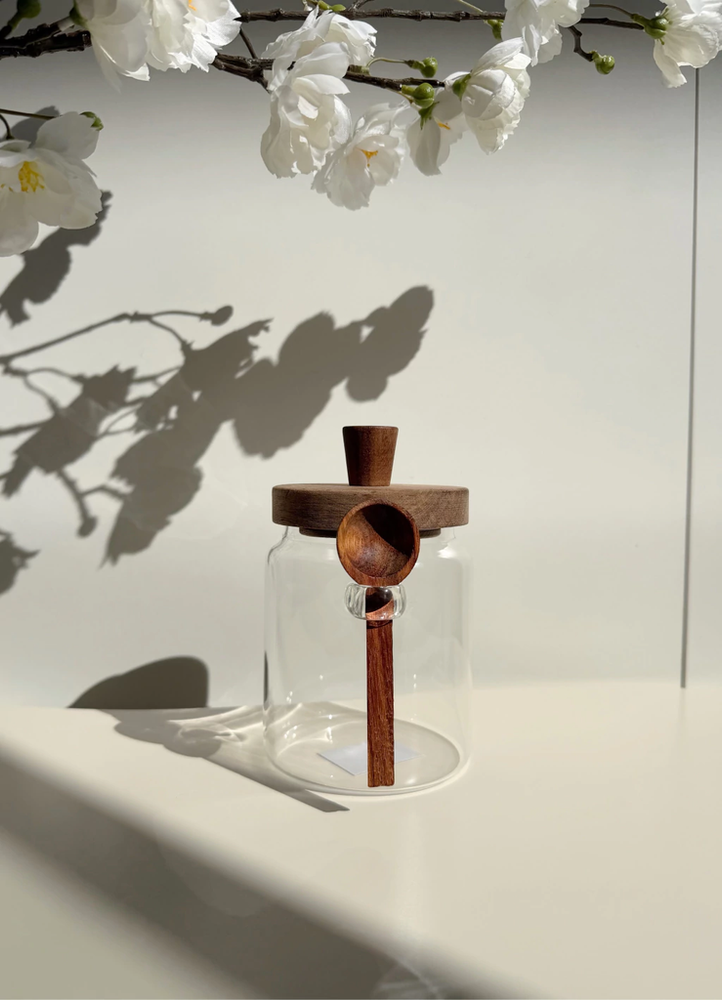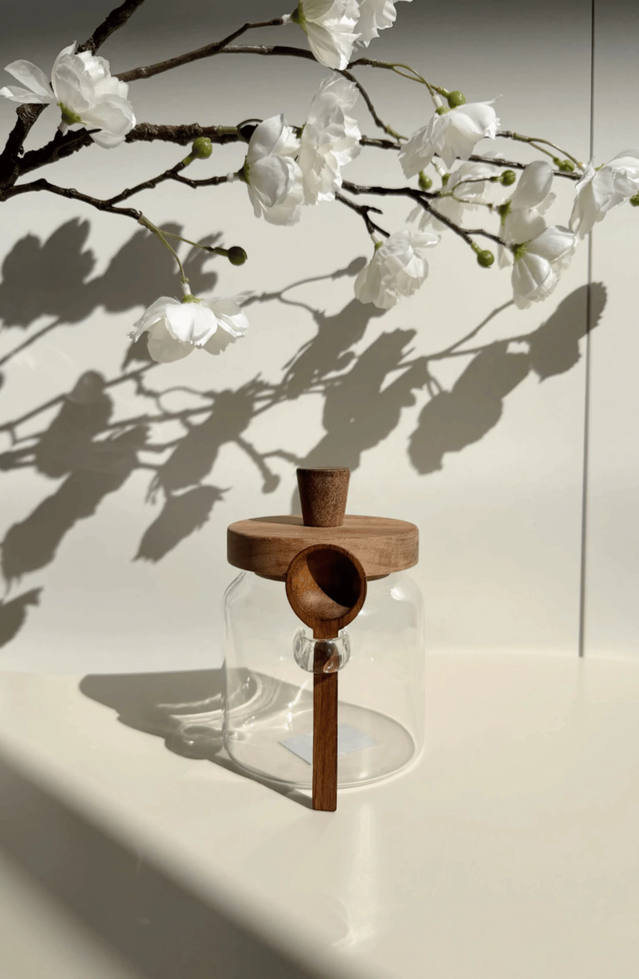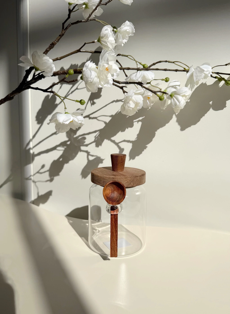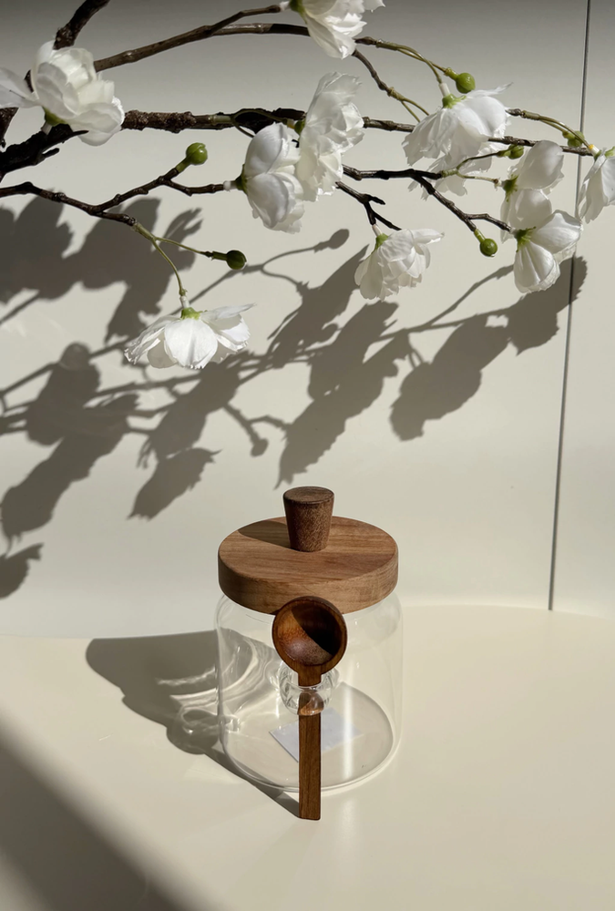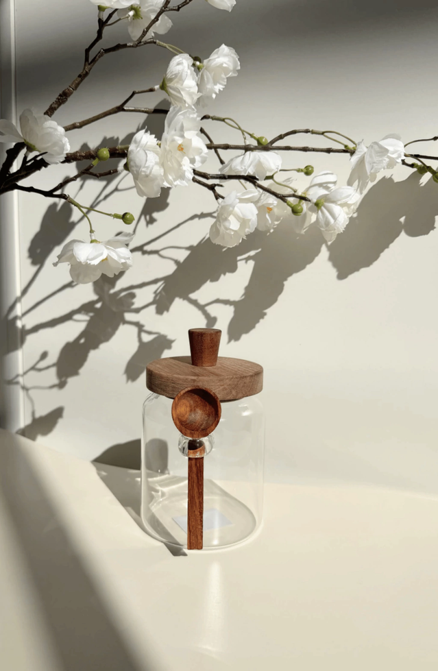 Frasco de vidrio con cucharita y tapa de bamboo con perilla