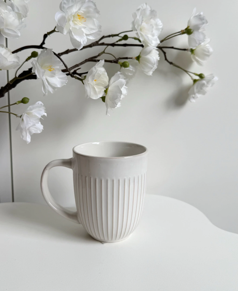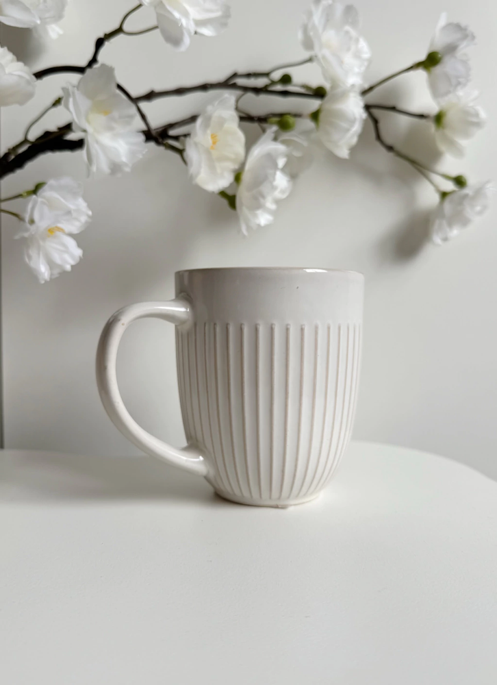 Taza Mug de porcelana blanca renosa con líneas largas,