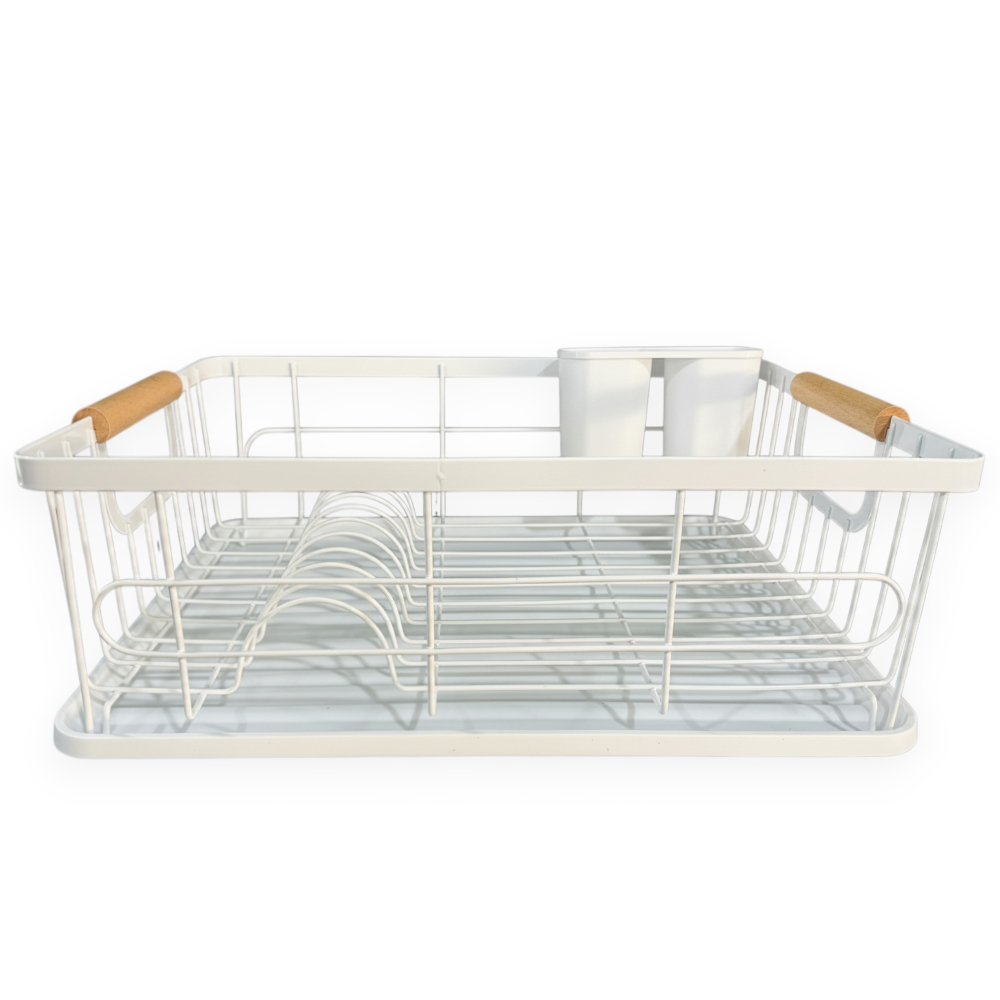Secaplatos canasto bajo con bandeja blanca y asa bambú