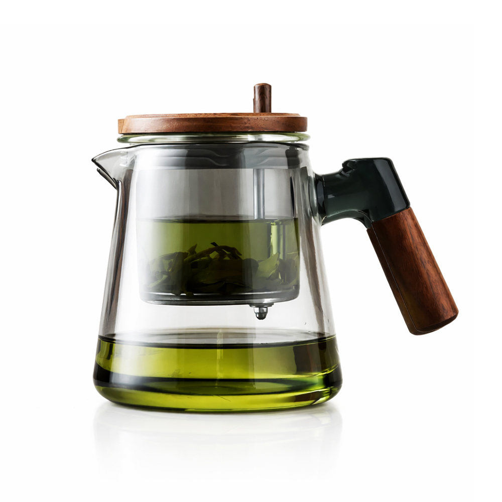 Tetera cónica de vidrio transparente con mago y tapa de bamboo oscuro y filtro de metal 800ml