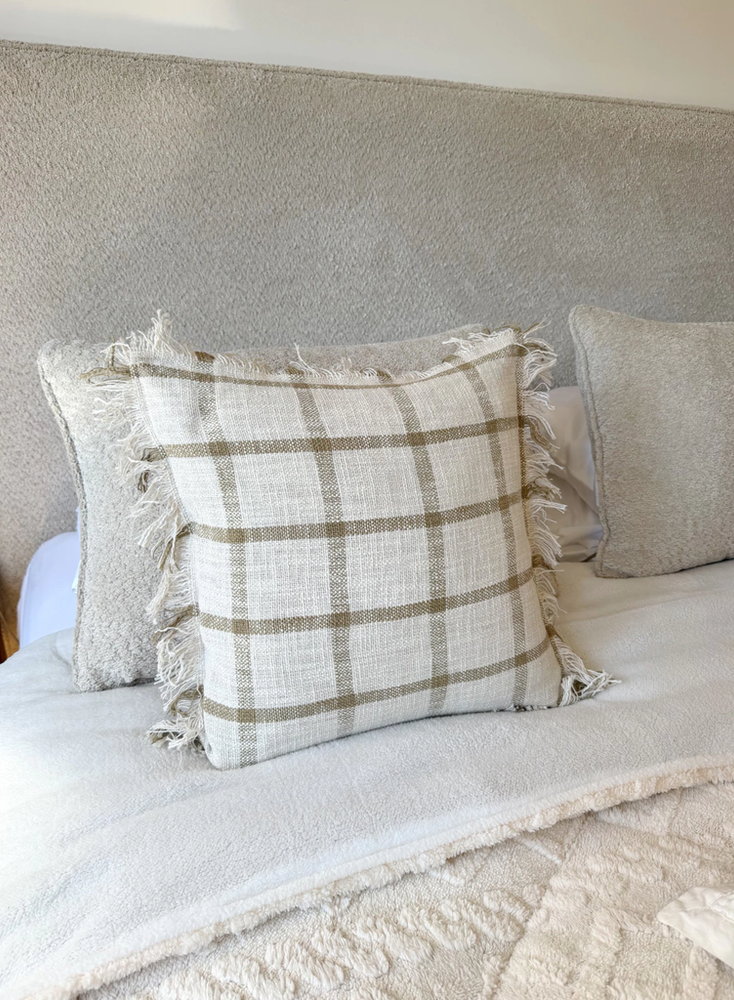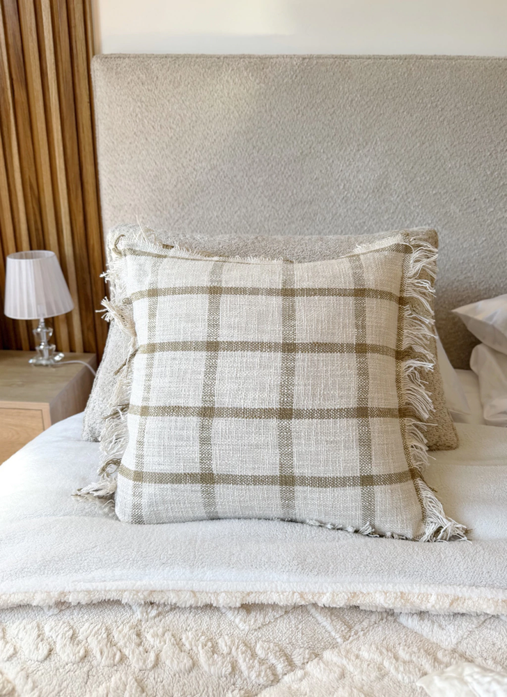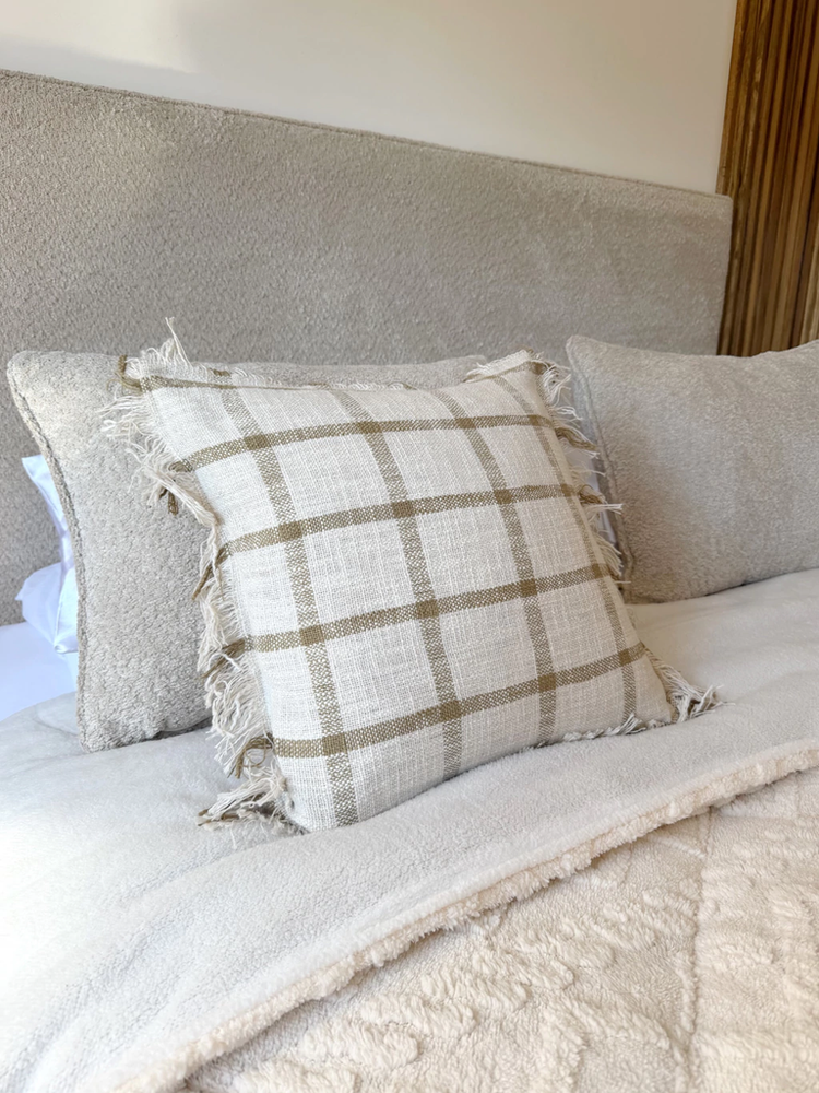 Funda de almohadón cuadriculada en color natural con lineas beige de