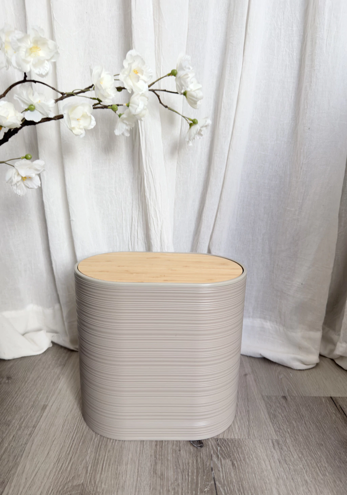Cesto tacho de basura oval rayado de plástico con tapa vaivén de bamboo