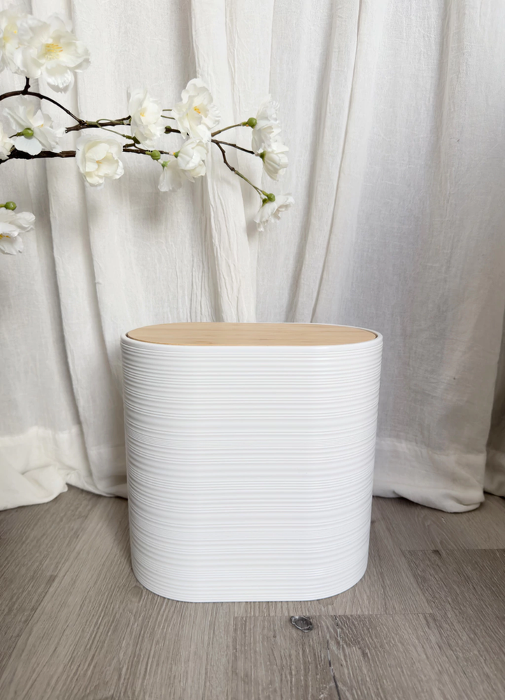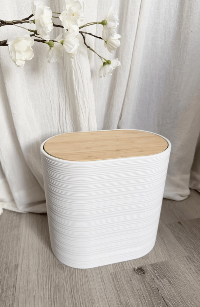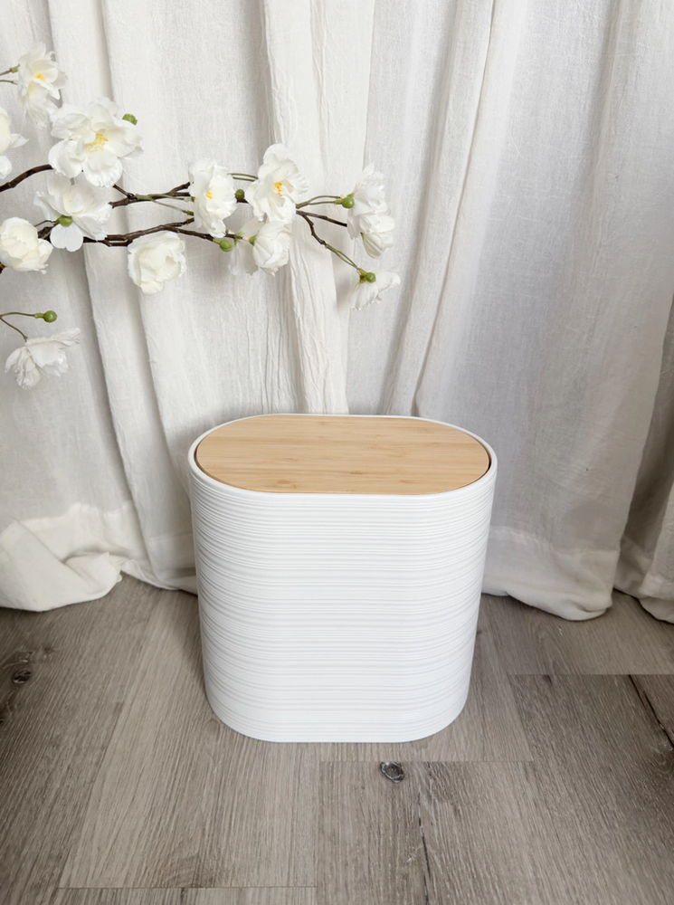 Cesto tacho de basura oval rayado de plástico con tapa vaivén de bamboo