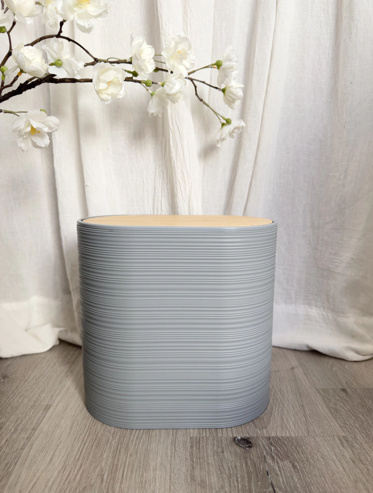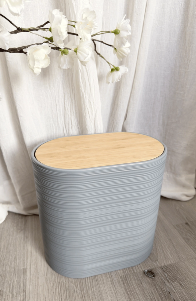 Cesto tacho de basura oval rayado de plástico con tapa vaivén de bamboo